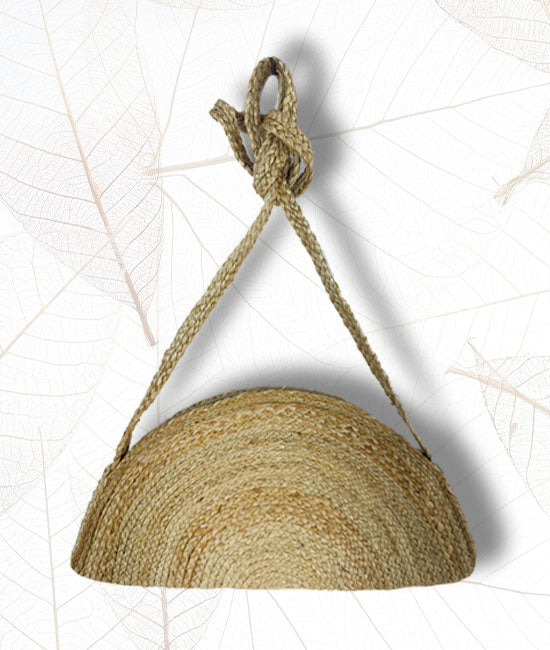 Elevate your style with this charming half moon-shaped side purse, expertly crafted from natural jute fibers. Its unique design adds a touch of sophistication to any outfit, making it perfect for both casual and dressy occasions.
